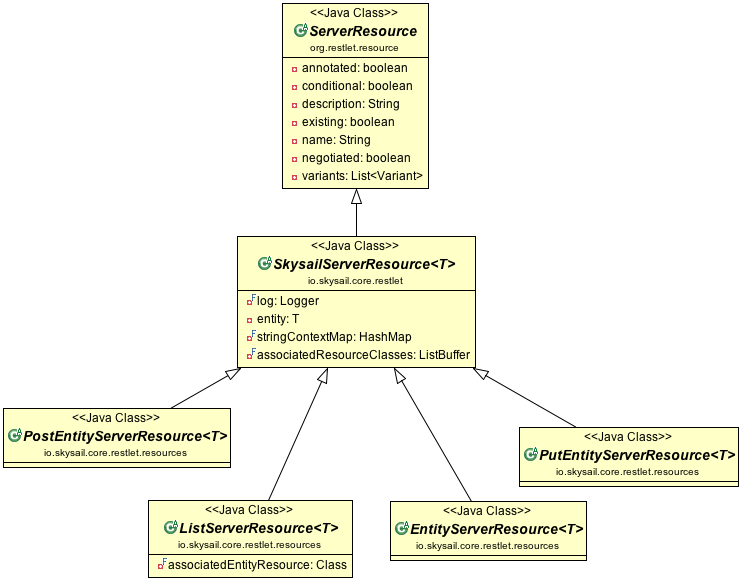 Resources play a crucial role in REST. Restlet, being the framework skysail builds upon, defines a class "org.restlet.resource.ServerResource" which should be extended to implement server-side resources. skysail extends this class with "SkysailServerResource" and resources in skysail typically extend the latter class.