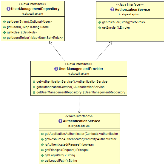 The central user management interface (including authentication and authorization) is the "UserManagementProvider", which provides access to an AuthenticationService, an AuthorizationService and a UserManagementRepository. Typically, a bundle will implement the two services itself and rely on an external UserManagementRepository, provided by another bundle.